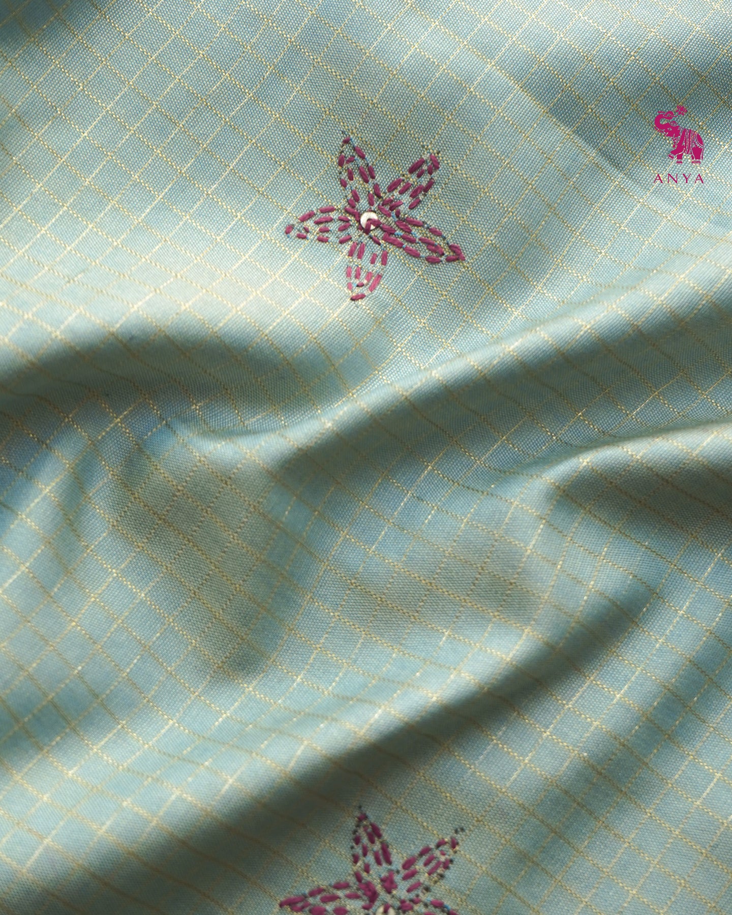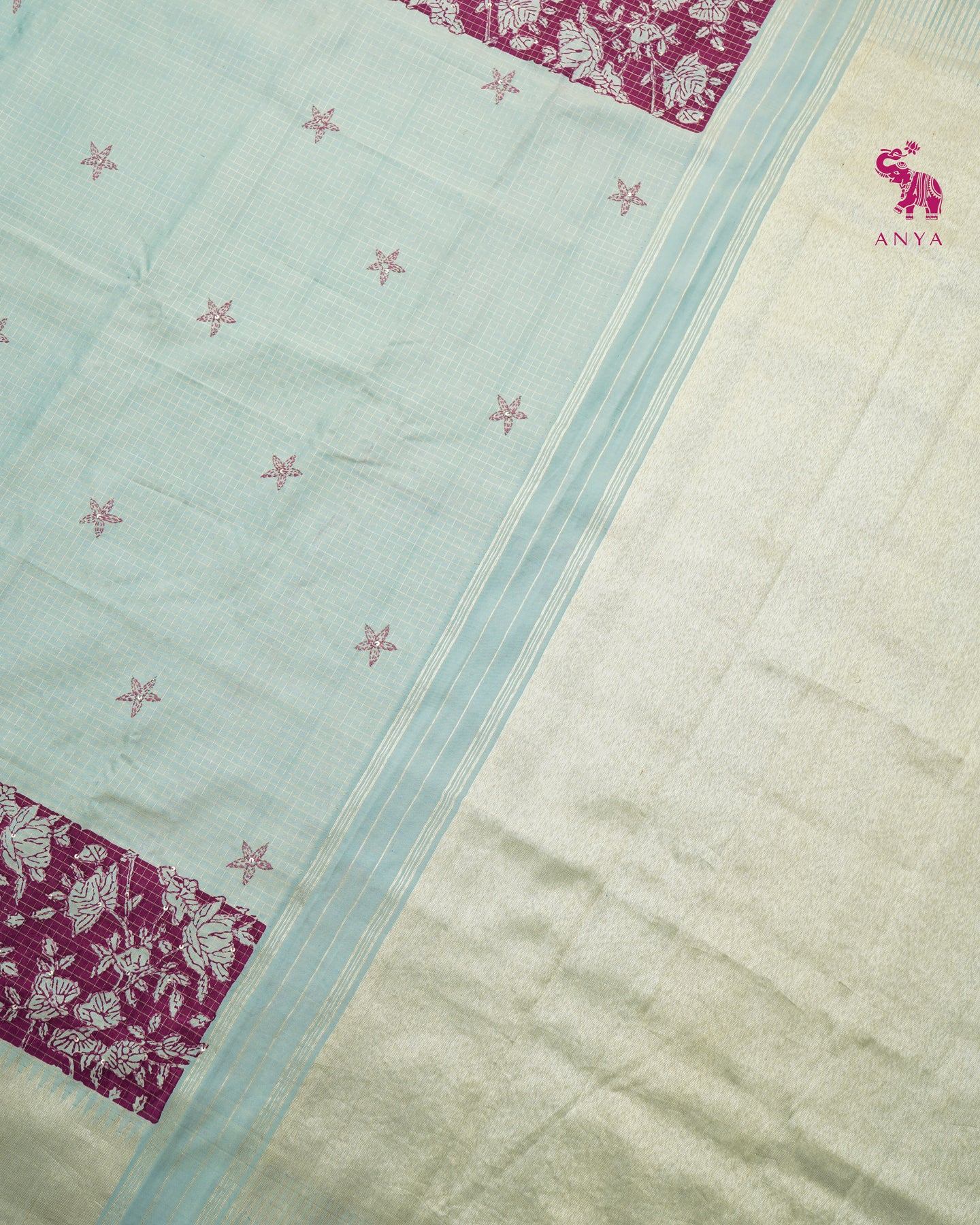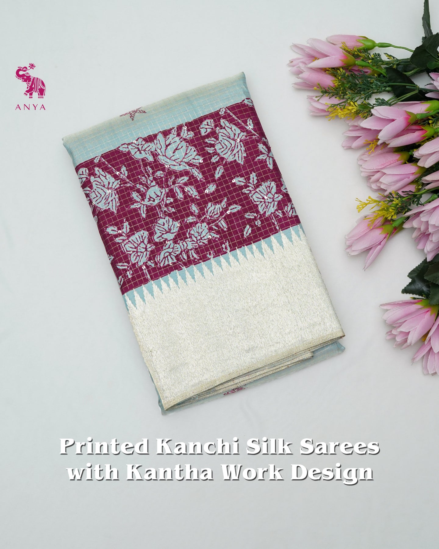 Greyish Blue Printed Kanchi Silk Saree with Kantha Work Design