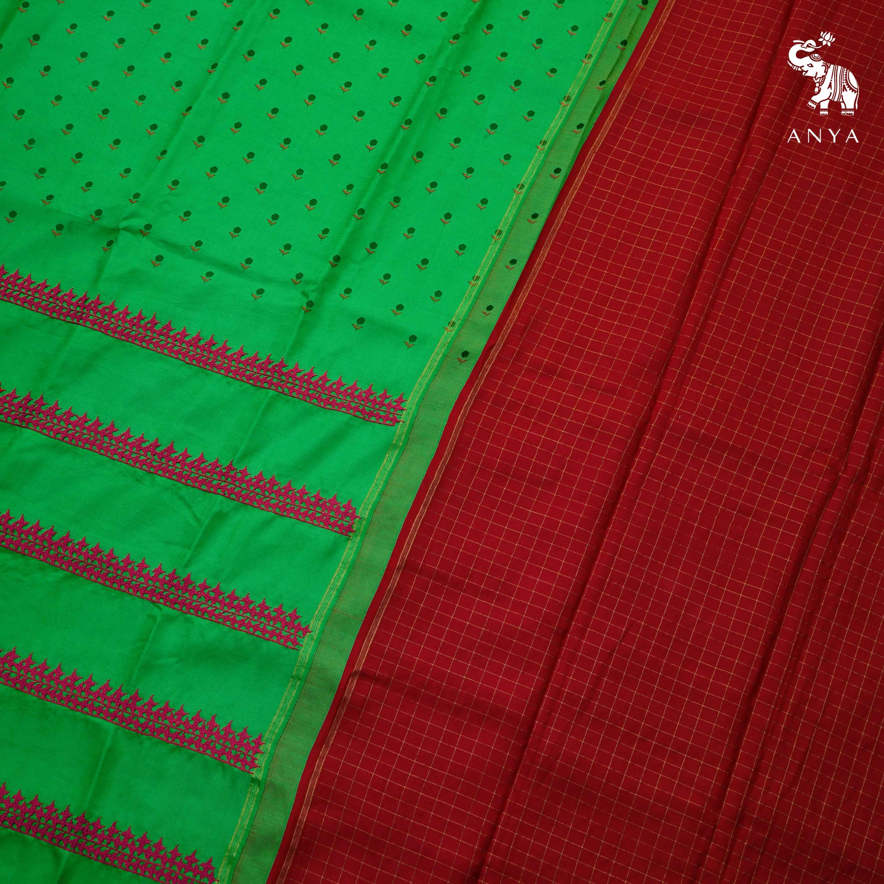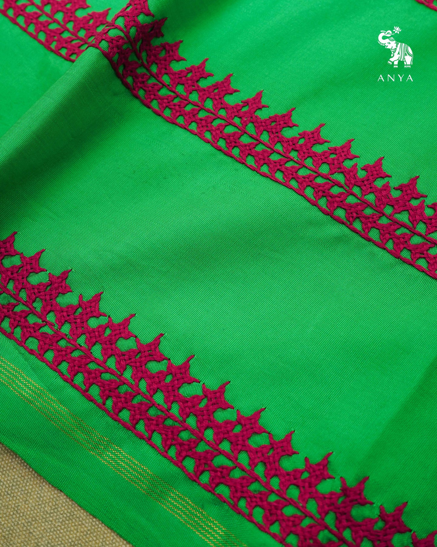Parrot Green Printed Kanchi Silk Saree with Kutch Work Design