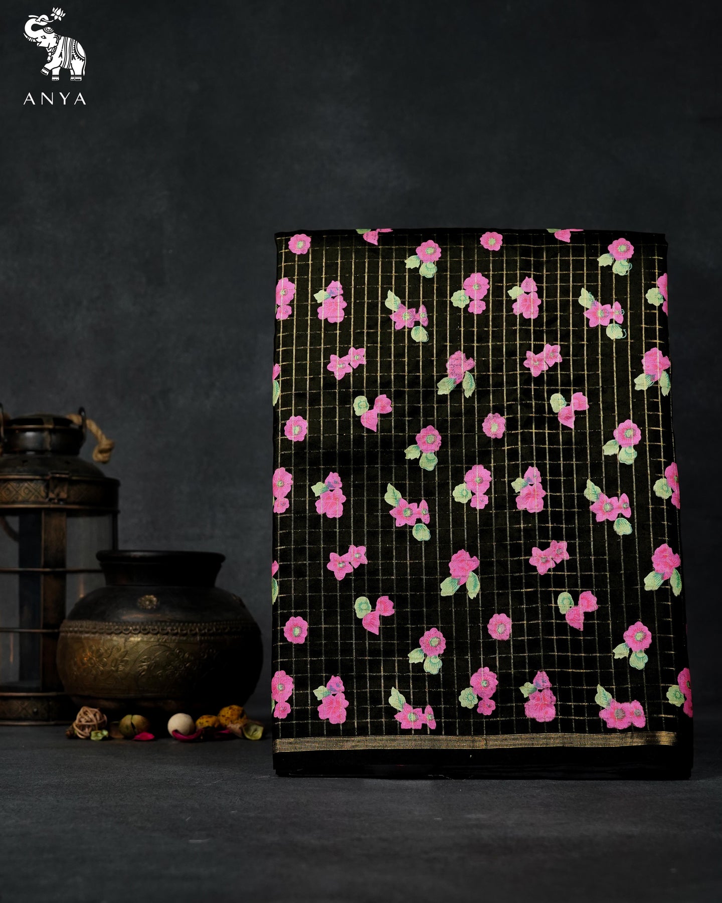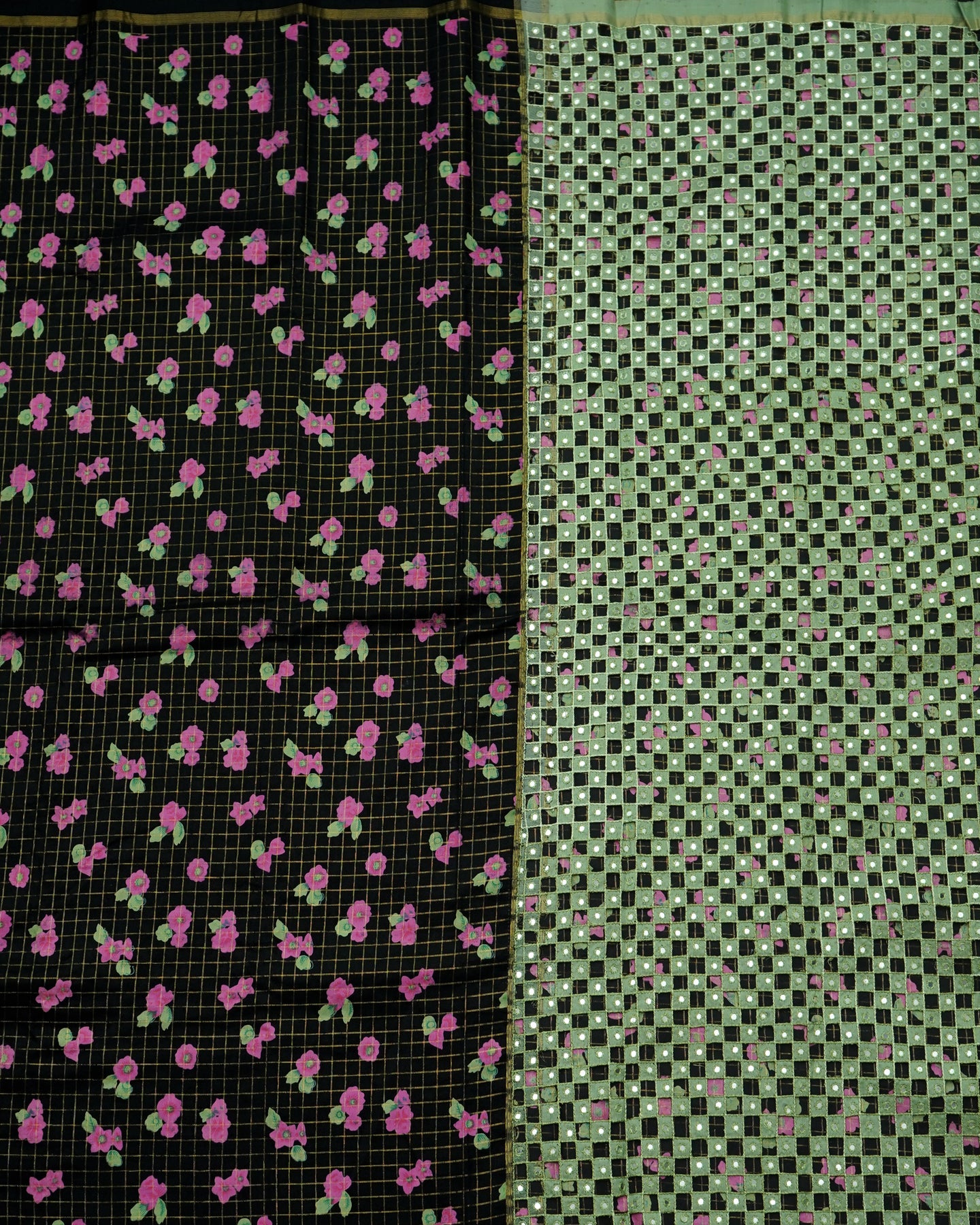 Floral Print and Zari Checks | Black |