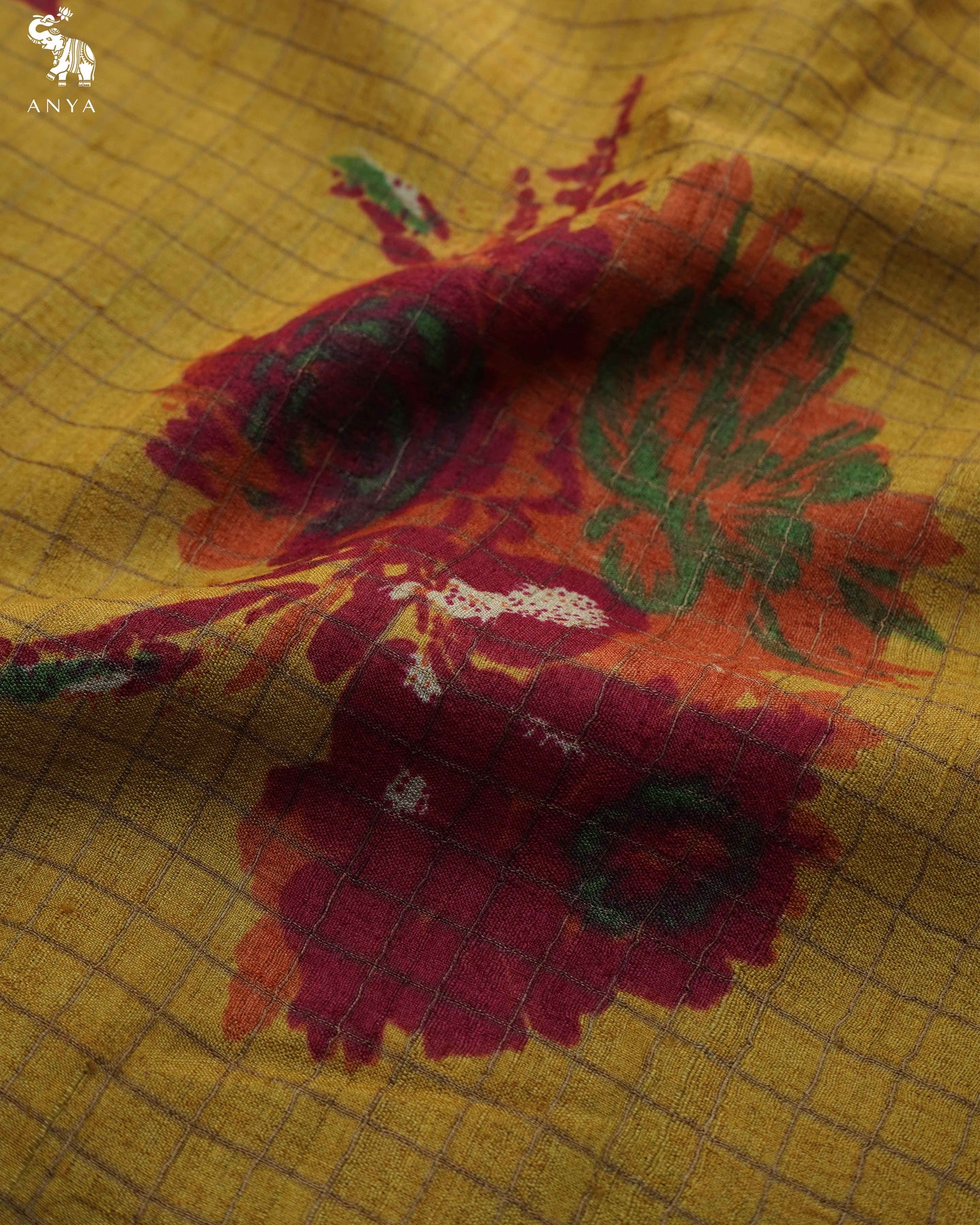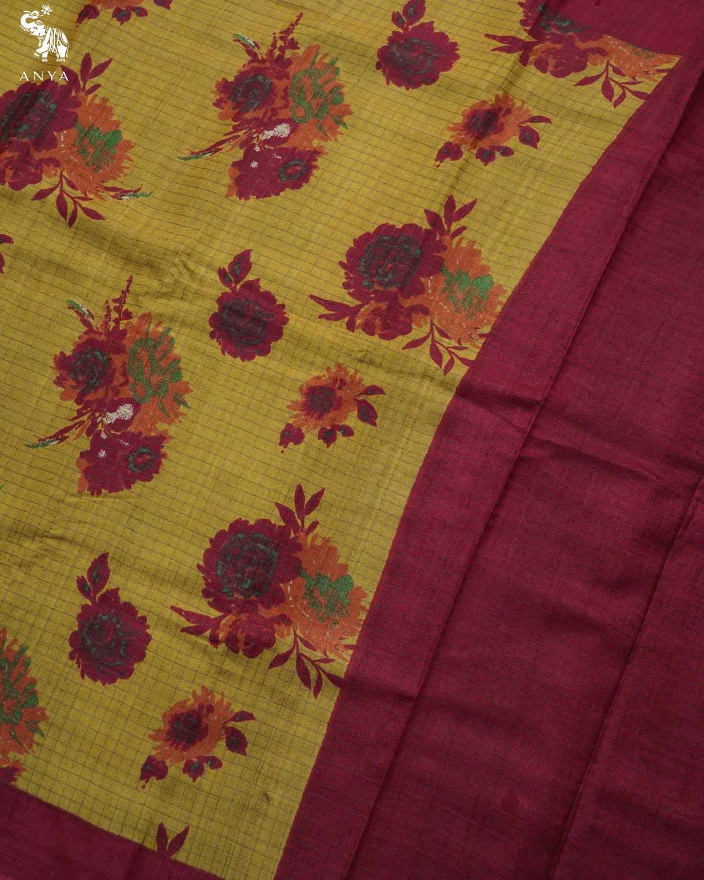 Mustard Tussar Silk Saree with Floral Print and Zari Checks Design