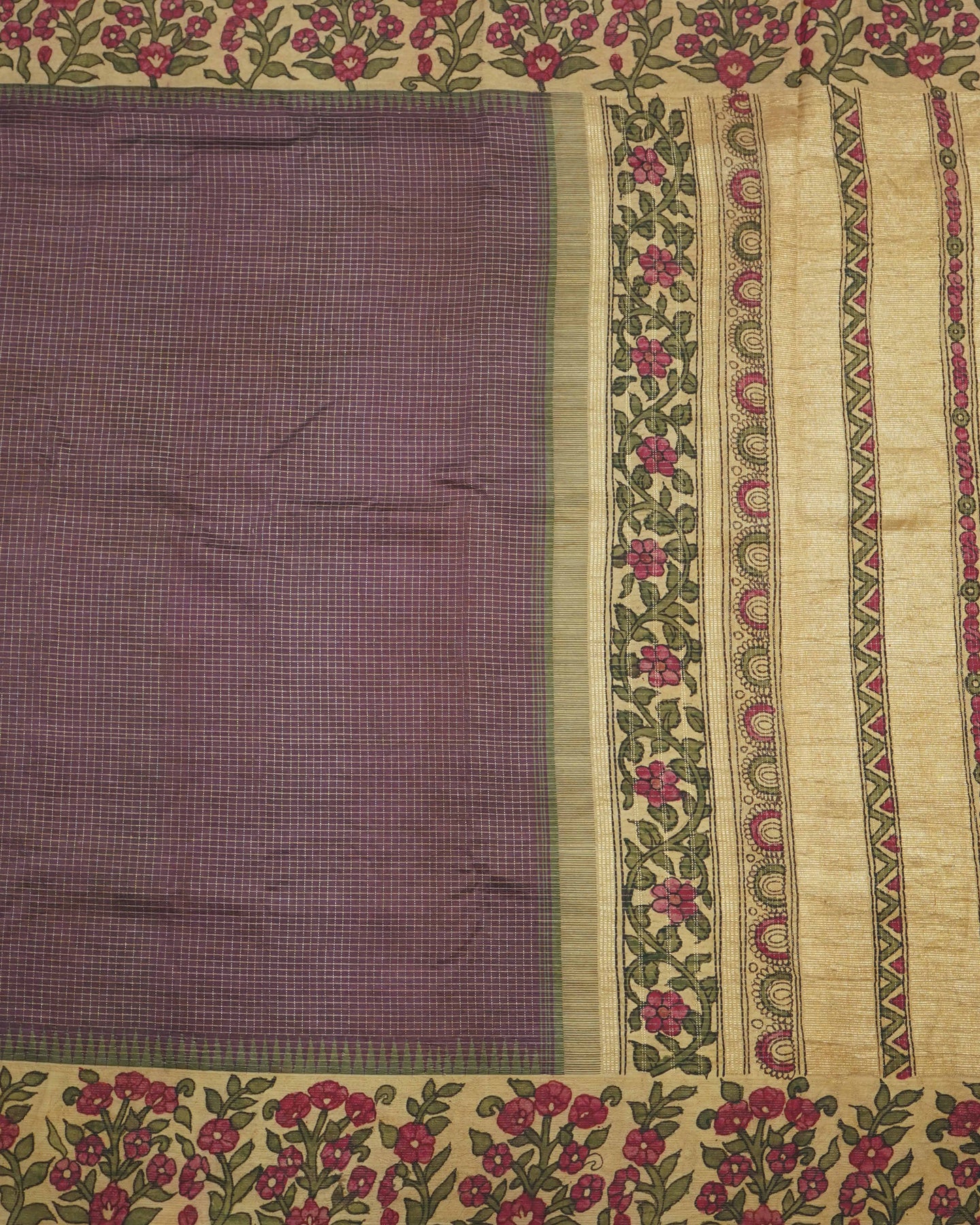 Wine Pen Kalamkari Kanchi Silk Saree with Zari Checks Design