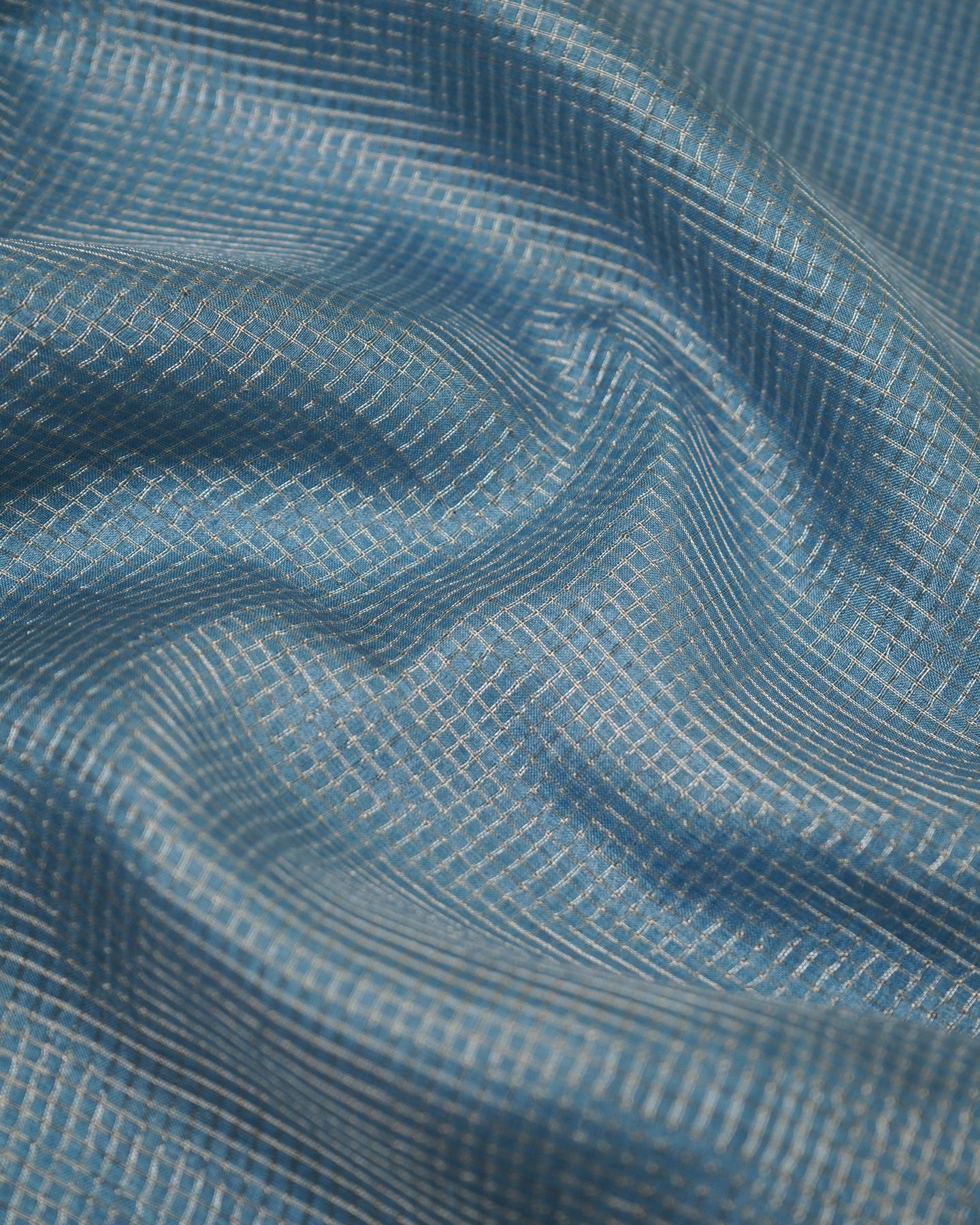 Blue Zari Checks Tussar Silk Saree with Mustard Pen Kalamkari Kanchi Border