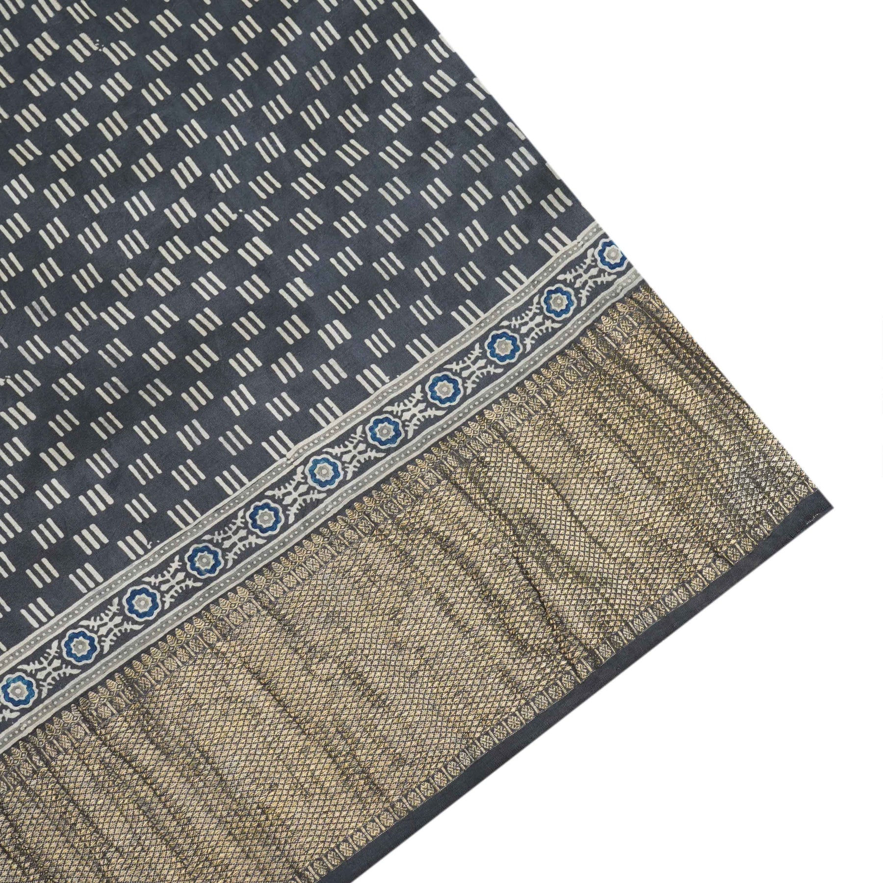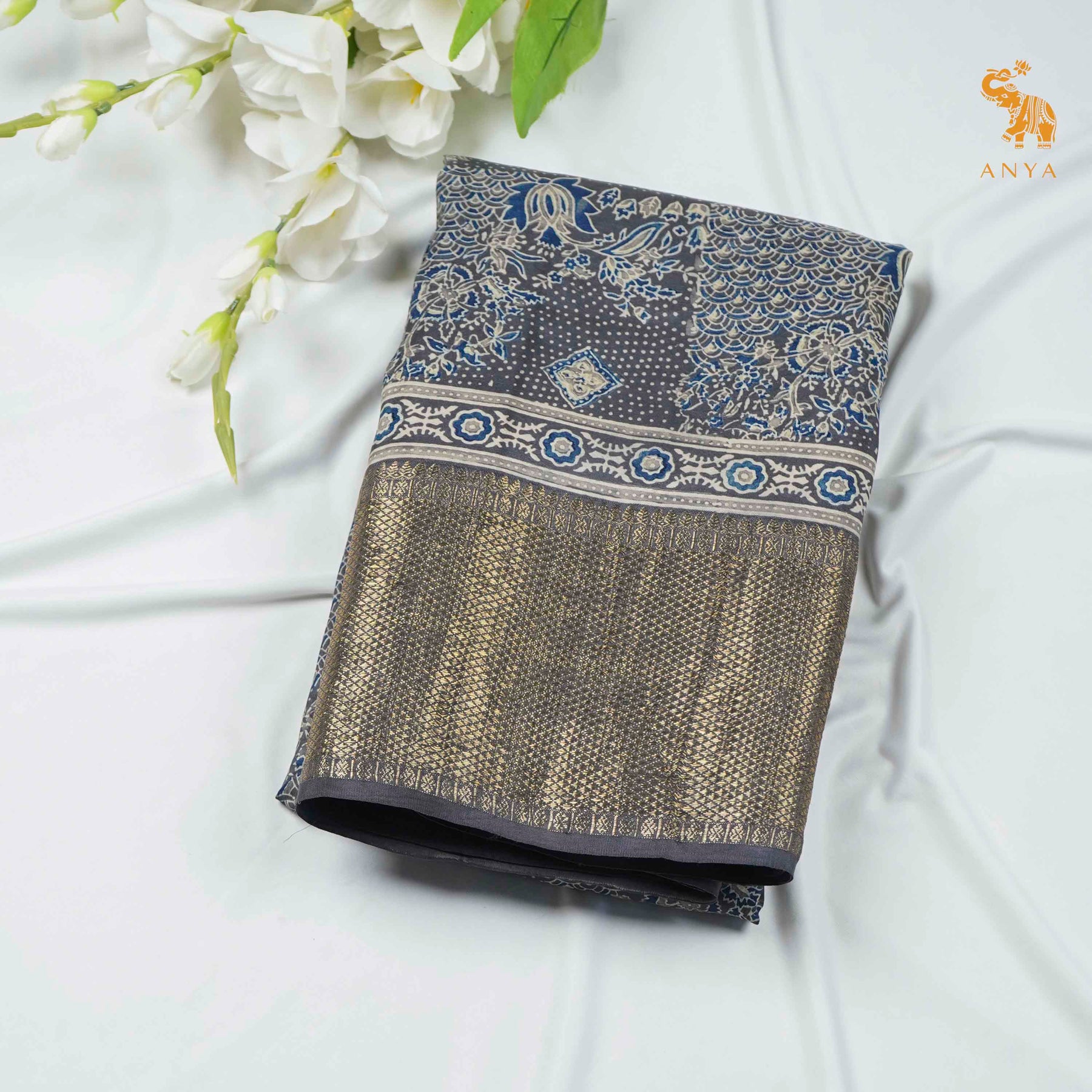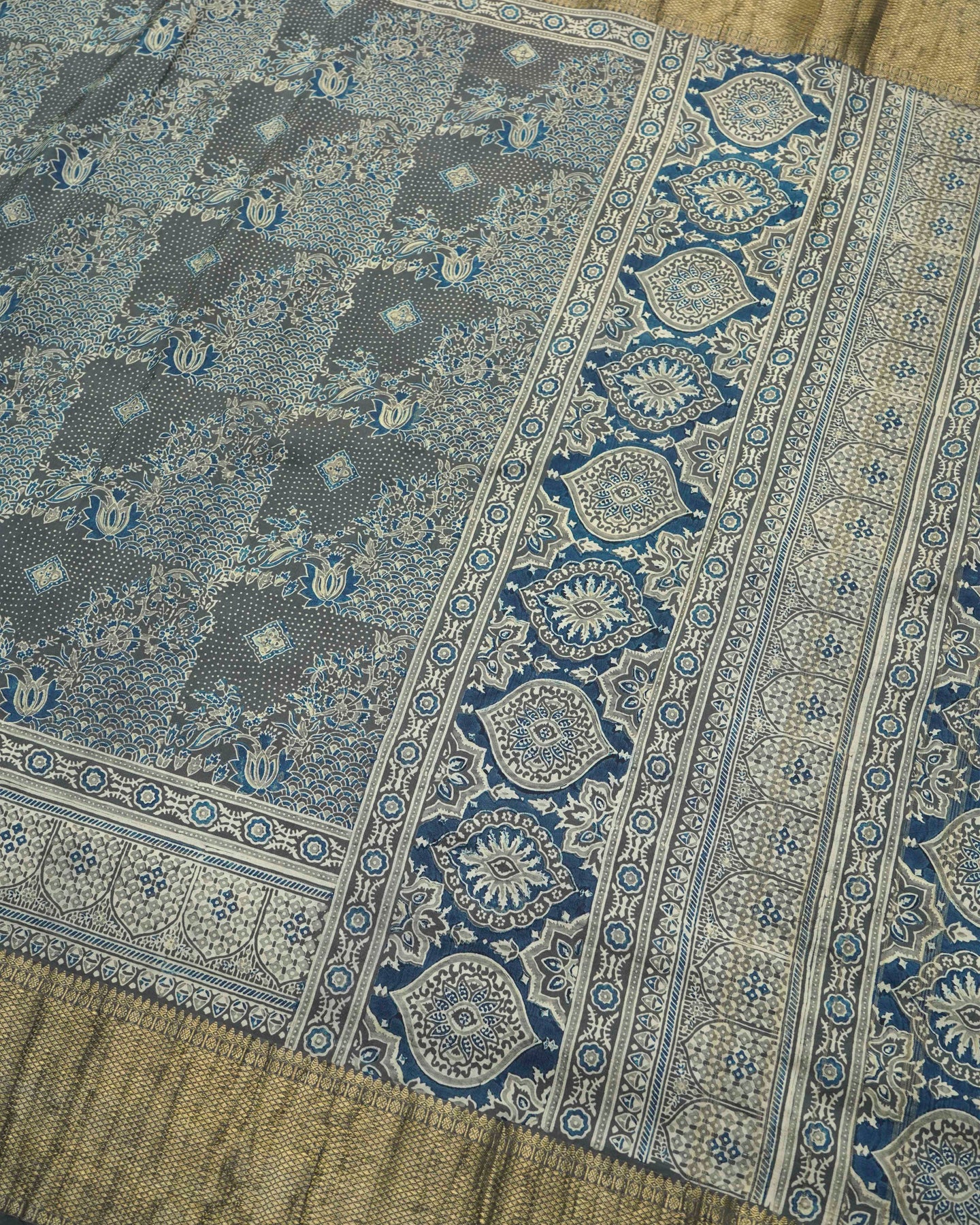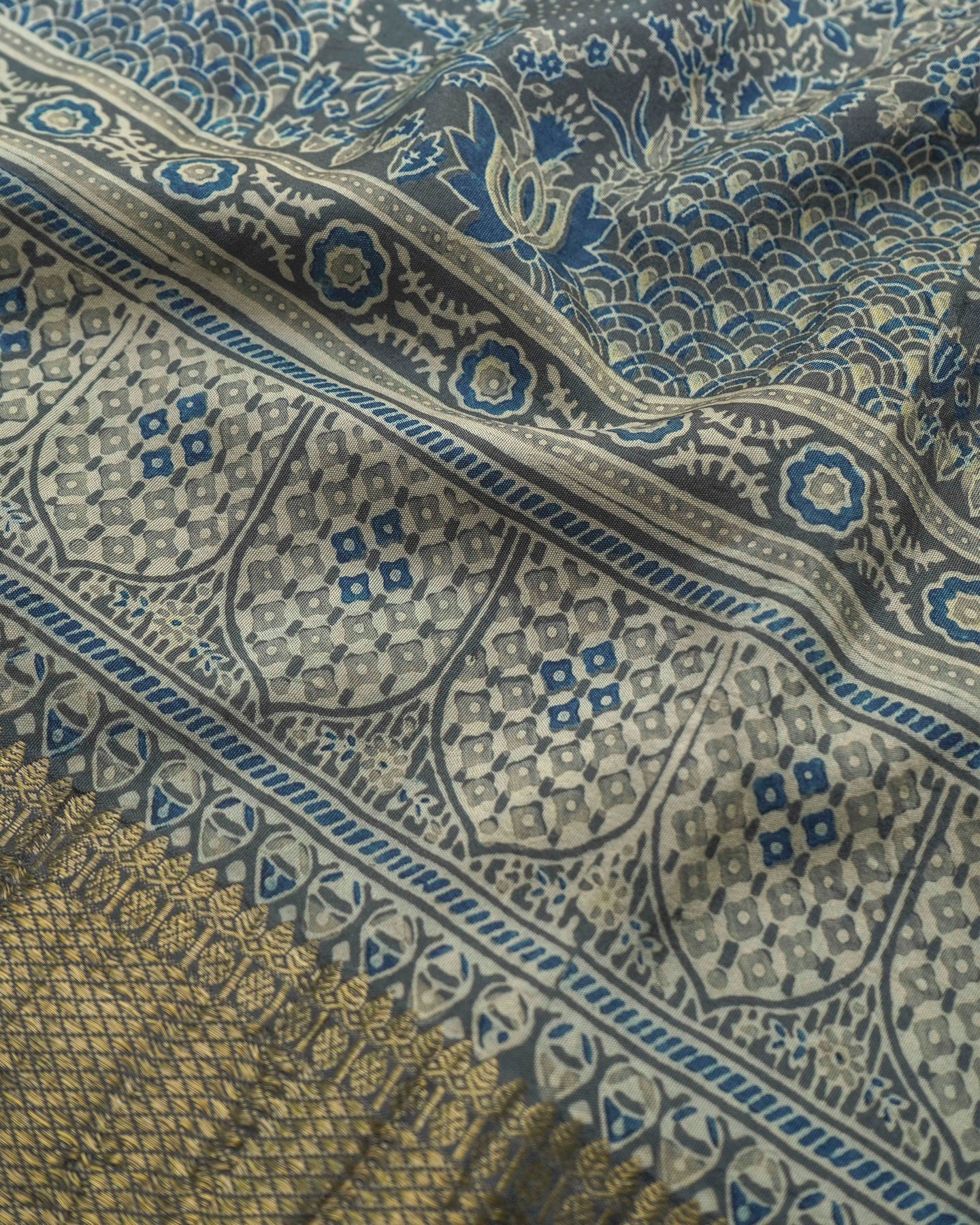 Greyish Blue Kanchi Silk Saree with Ajrak Print Design