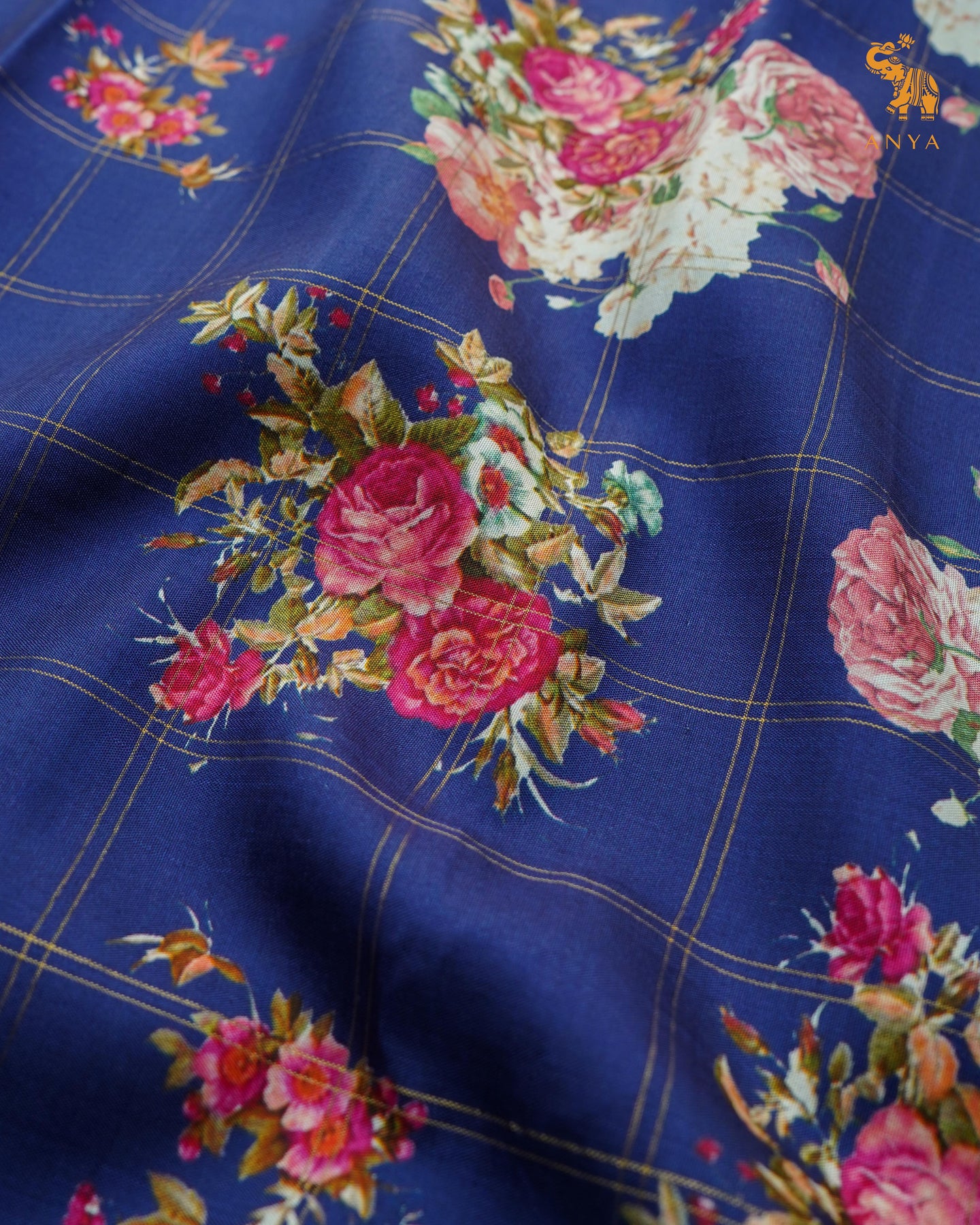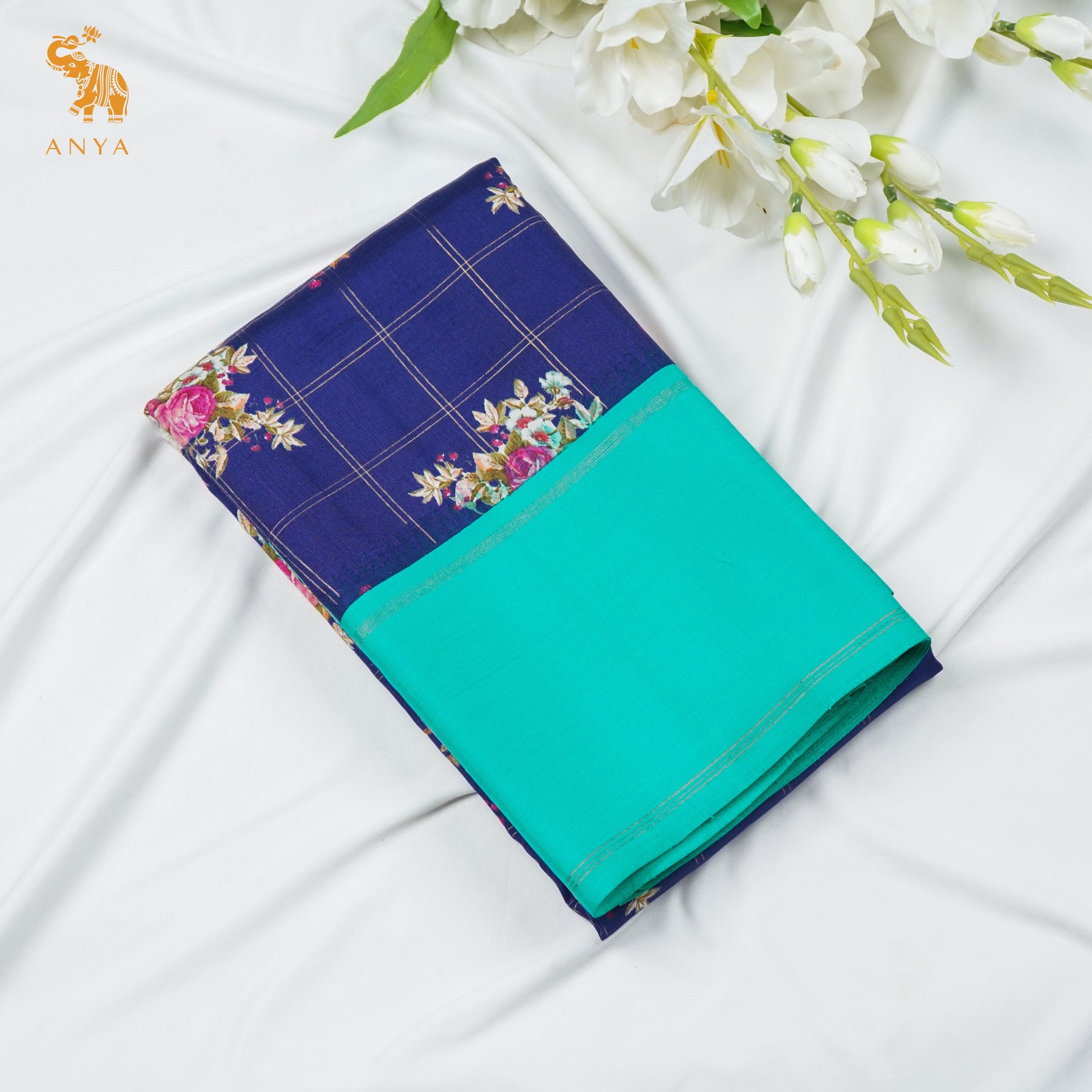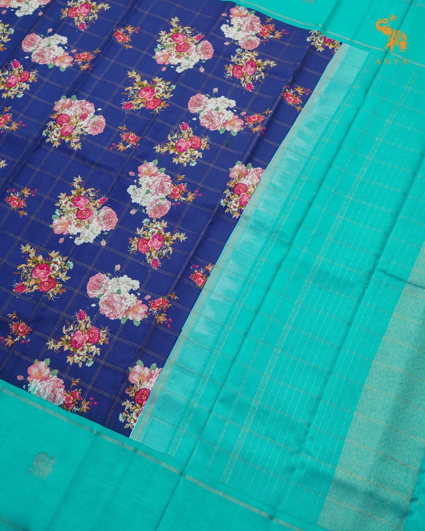 Navy Blue Printed Kanchi Silk Saree with Zari Kattam and Floral Design