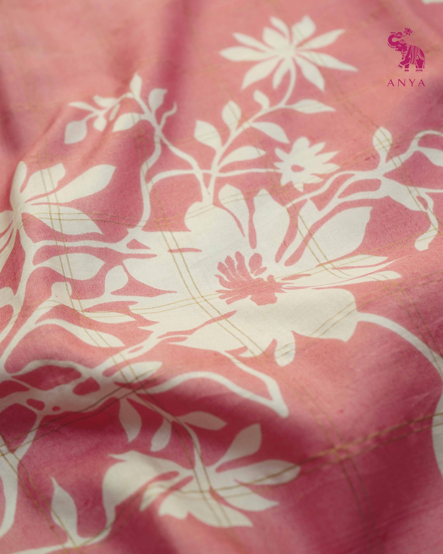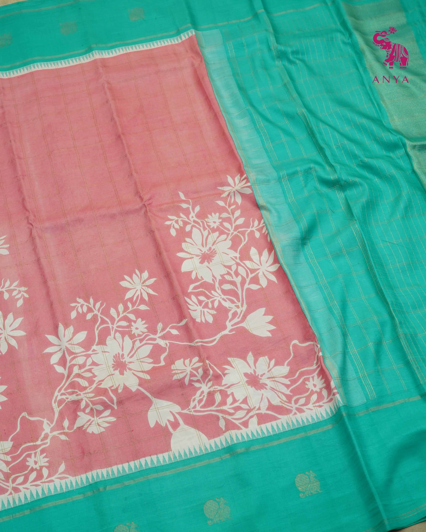 Pink Printed Kanchi Silk Saree with Floral Print and Checks Design
